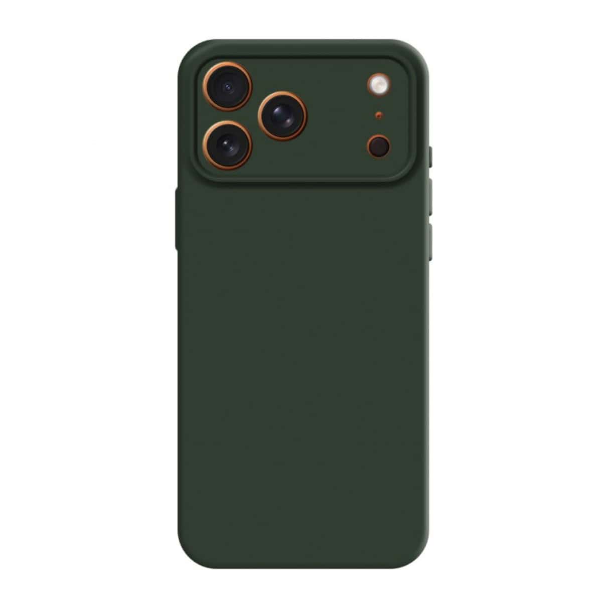 | 1 capa iPhone 17 Pro verde tropa em silicone com interior forrado e proteção de câmara. |
