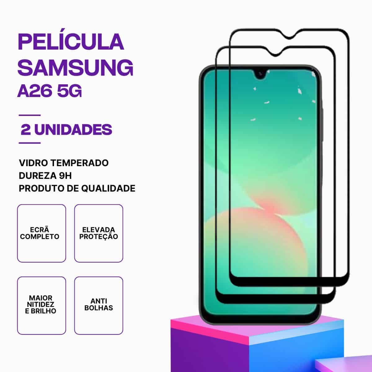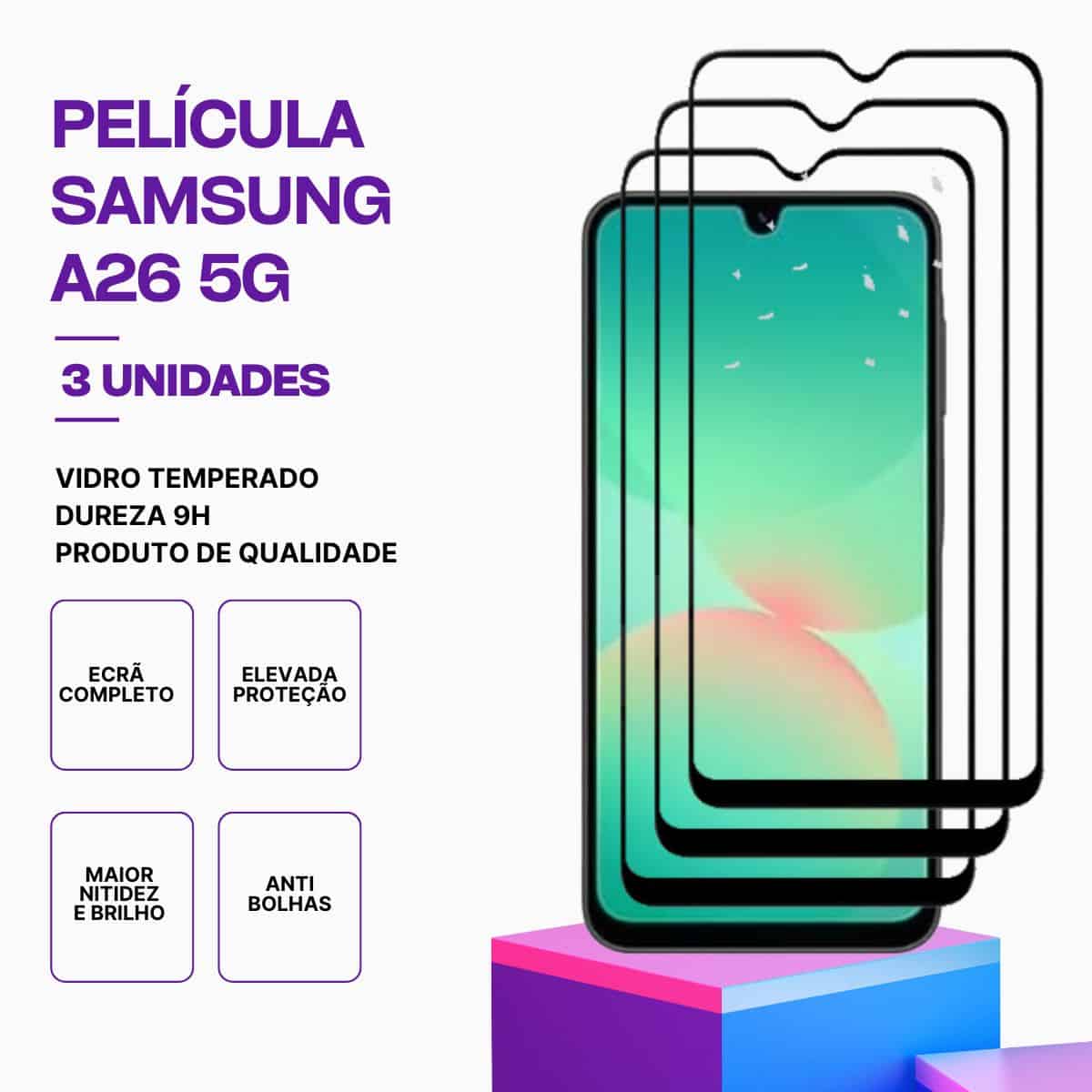 - ✅ Película Samsung A26 5G de vidro temperado 9H, proteção contra riscos e pequenos impactos