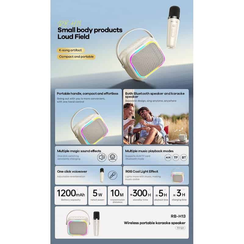 Texto otimizado para SEO, se procuras um sistema de karaoke portátil com microfone incluído, o Remax RB H13 é uma opção prática, com coluna 5W, Bluetooth 5.4, luz RGB, bateria 1200 mAh e ligações TF, USB e AUX, perfeito para cantar em casa, em festas e em momentos de convívio.